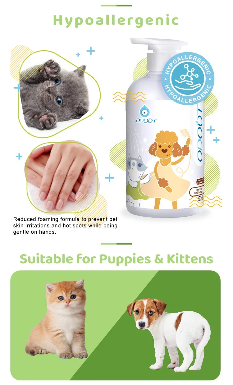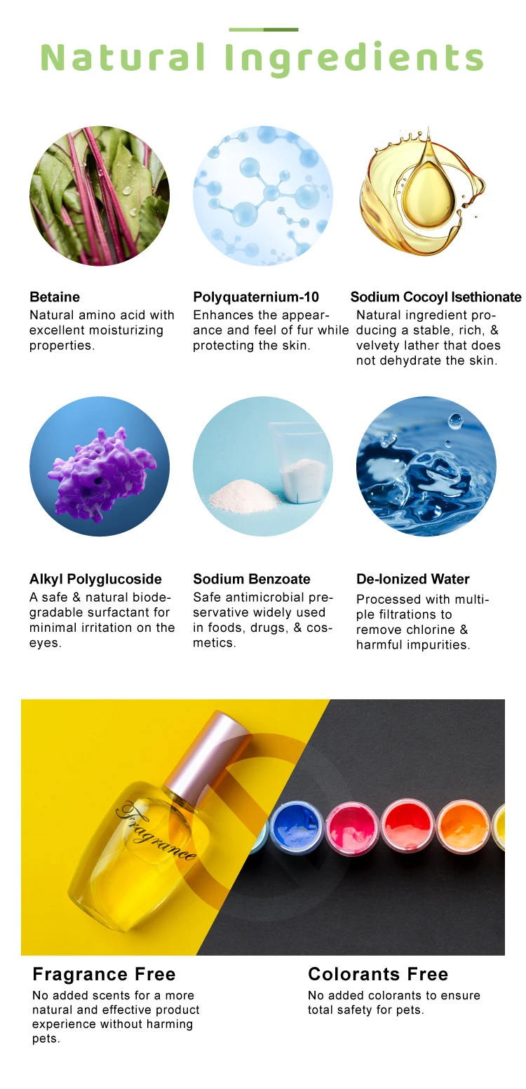 Tearless grooming of pet fur while eliminating odor, grease & dirt.