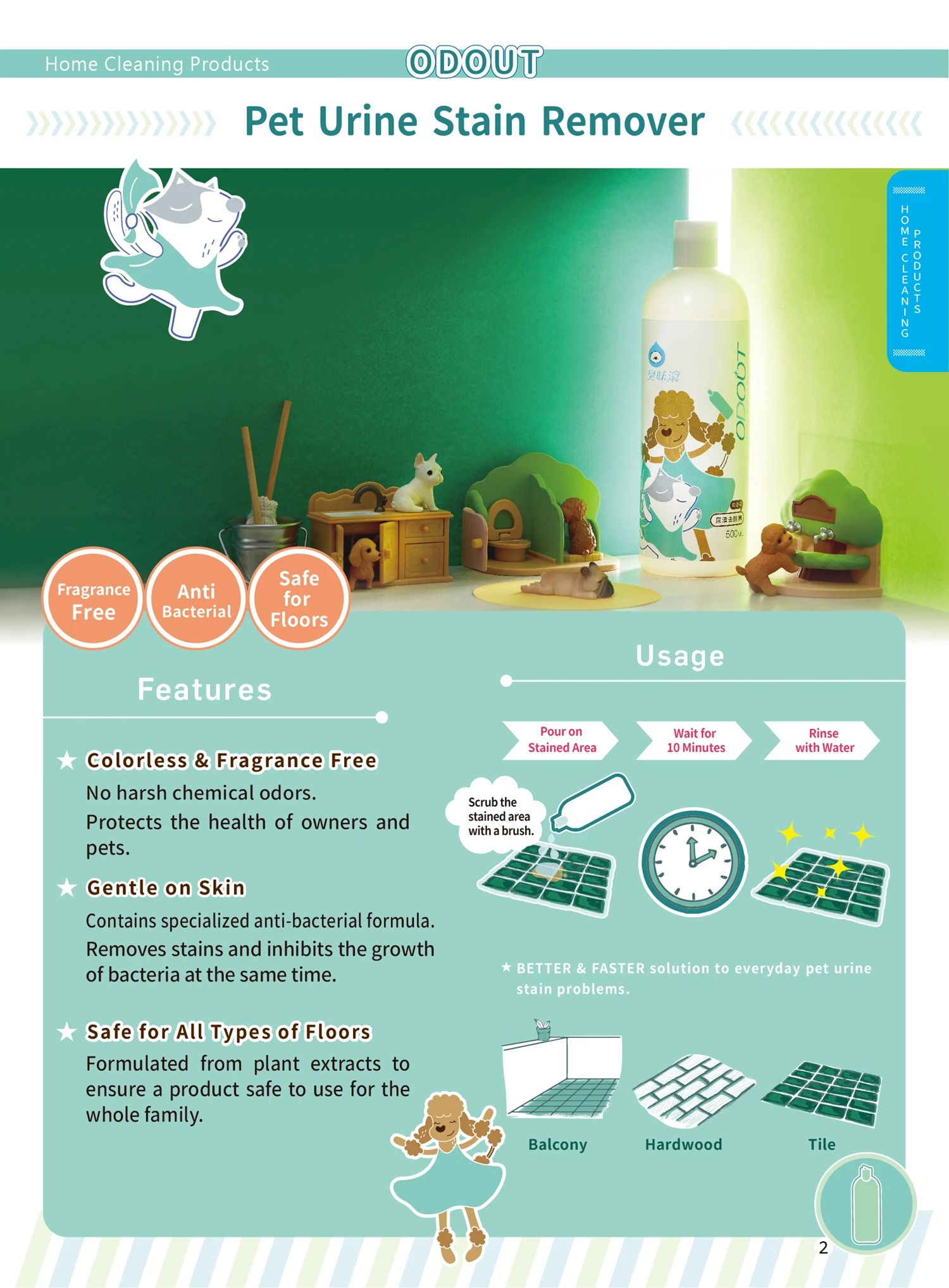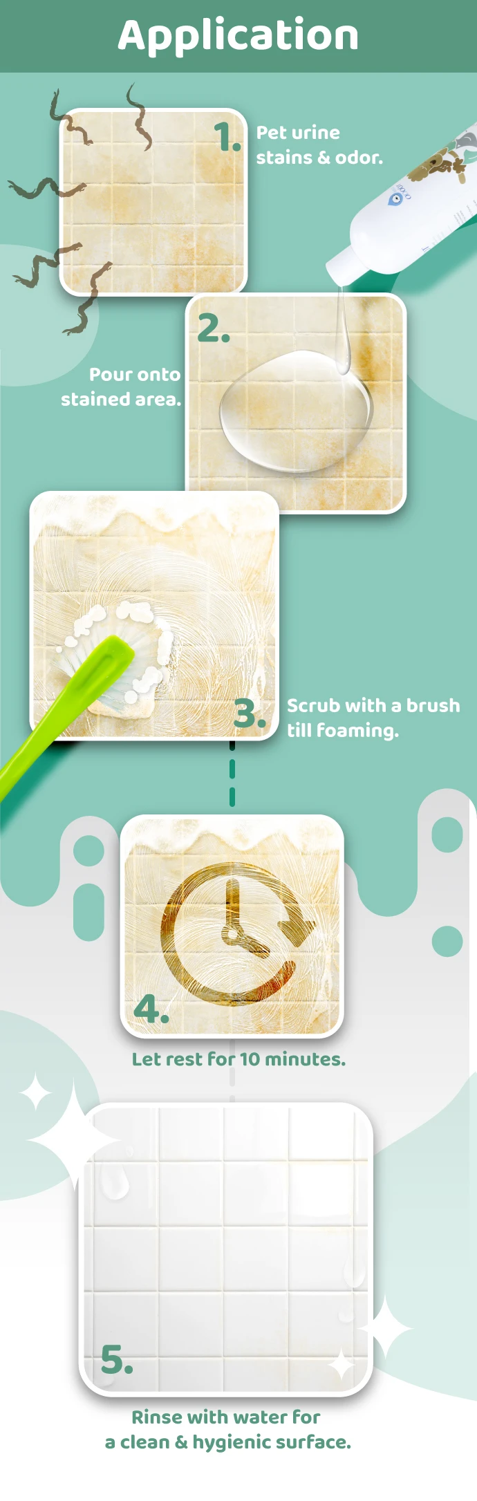 Pet urine stain eliminator suitable for all types of floor surfaces.